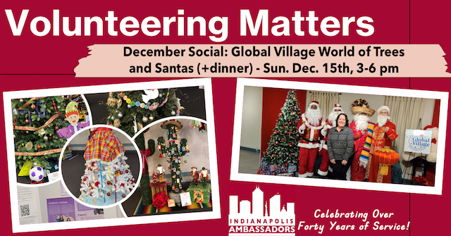 Come and celebrate the excitement and joy of the holiday season at Indy’s Global Village. Christmas trees are individually decorated to represent different countries and live Santas will be dressed in country-themed costumes. See the IA Christmas tree, our IA Santa (Christopher), and visit our table. Also you can browse the World of Trees, shop at the Holiday Bazaar and listen to festive music of the season.SocialMeetupGVWC